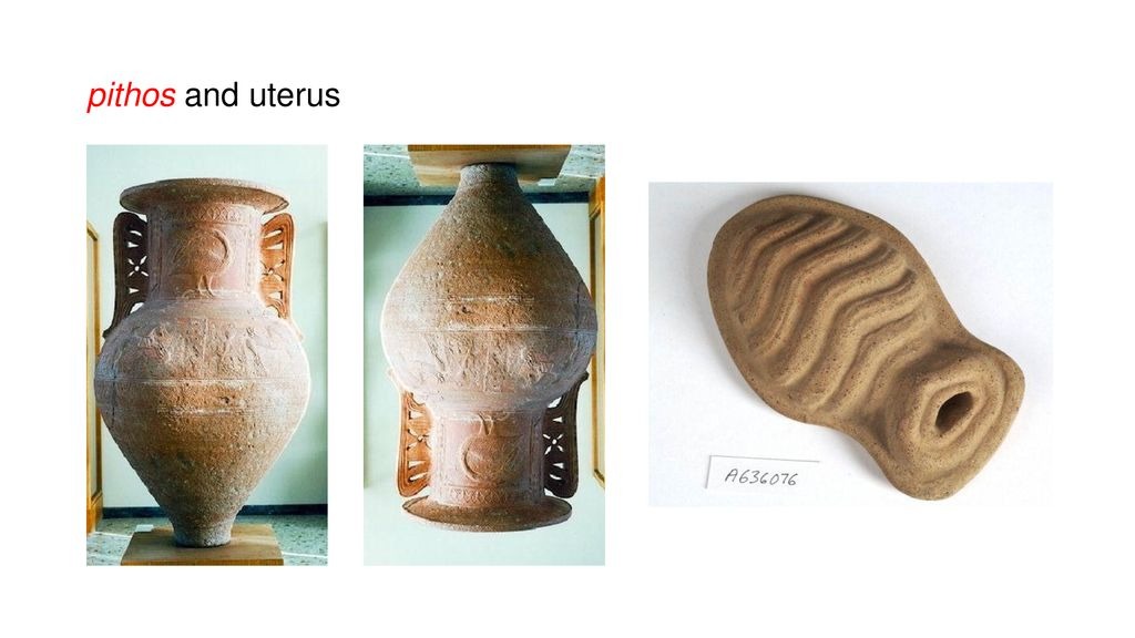 I also like to show this image to my students of a pithos (large storage jar), which is the term used in Hesiod for Pandora’s “container,” and to note that a) it is not a box, and b) it is a term that is used sometimes in ancient medical texts to describe the womb or uterus (the image on the right is an ancient clay votive of a uterus for comparison).